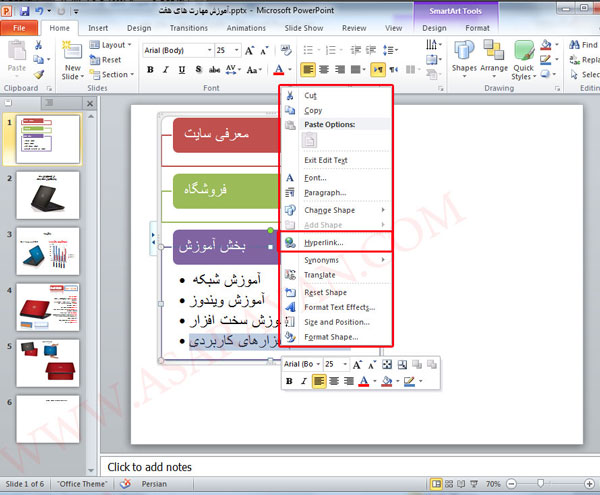 8. بر روی متنی که می خواهید به صفحه مقصد لینک دهید کلیک راست کرده گزینه Hiperlink را بزنید.