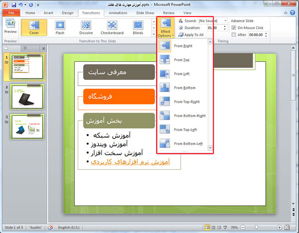 مثال اگر اسلاید شما از سمت راست نمایش داده می شوند می توانید نوع نمایش را به سمت