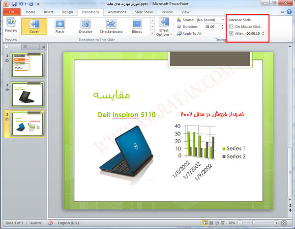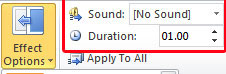 بخواهید هنگام نمایش اسلاید یک صدا هم پخش شود .دیگری Duration مدت زمان نمایش