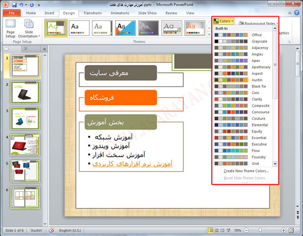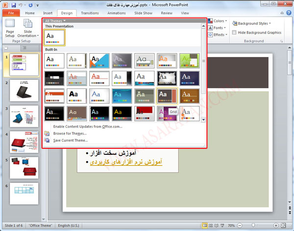 2. اما مهمترین بخش در تب Design قسمت Themes می باشد . شما در این بخش می توانید