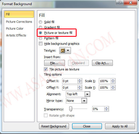 4. در صورتیکه گزینه Picture Or Texture را در قسمت Fill تیک بزنید سه گزینه بعدی