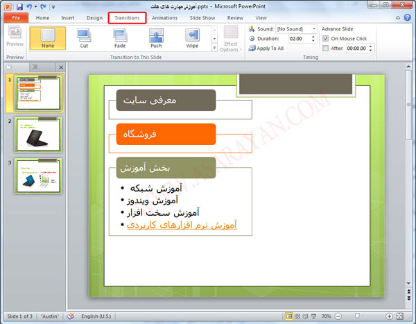 شما در تب transitions می توانید نحوه نمایش اسلایدها را تعیین کنید به عنوان مثال