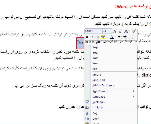 برای آنکه بتوانید املای صحیح کلمه را ببینید کافیست کلمه مورد نظر را انتخاب کرده و بر روی آن راست کلیک کنید تا لیستی که صحیح کلمه تایپ شده در آن است برایتان باز شود وآن را انتخاب کنید.