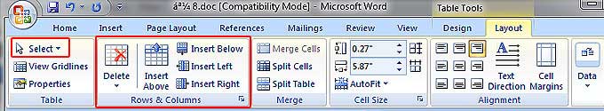اولین گزینه این تب گزینه Select است که برای انتخاب Sellect Cells (سلول)،Select Column (ستون)،Select Row(سطر)،Select Table(کل یک جدول) مورد استفاده قرار می گیرد.