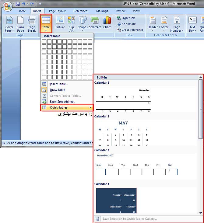 برای ایجاد جدول می توانید از تب Insert گزینه Table را انتخاب کنید.با انتخاب این گزینه کادری برای شما باز می شود که می توانید با استفاده از آن و کشیدن مؤس بر روی آن جدولی تا ماکزیمم 10 در 8 ایجاد کنید.