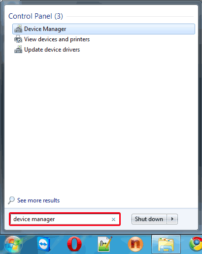 1. برای انجام اینکار بر روی منوی استارت کلیک کرده و در کادر جستجو تایپ کنید Device Manager . در بالای کادر جستجو نتایج نمایش داده می شود . گزینه مورد نظر را انتخاب و بر روی آن کلیک کنید .