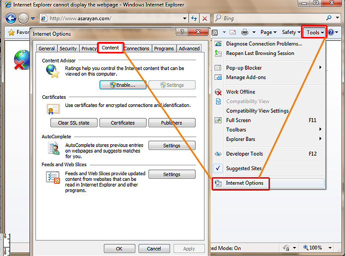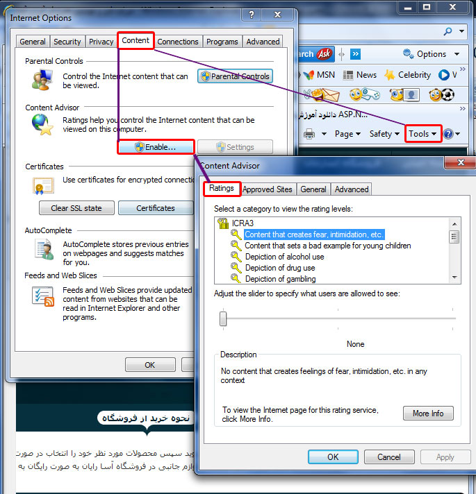 1.در منوي Tools از Internet Explorer روي گزينه Internet Options كليك كنيد.سپس در كادر محاوره Internet Options روي زبانه Content كليك كنيد