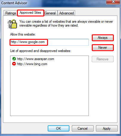 4.سطح محدوديت هر يك از گروه هاي محتوايي را مطابق نظر خود تنظيم كرده و در پايان روي زبانه Approved Sites كليك كنيد .