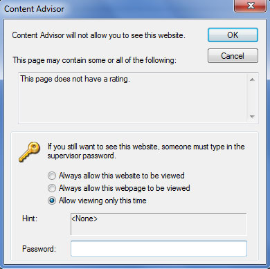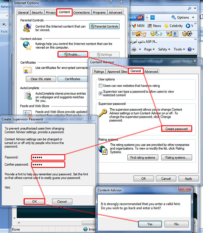 اگر يك رمز عبور را براي Content Advisor ايجاد نكنيد اولين باري كه اين ويژگي را فعال مي كنيد از شما درخواست خواهد كرد كه يك رمز عبور را ايجاد كنيد.