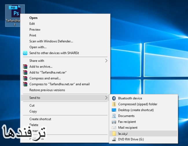 هنگامی که بر روی یک فایل راست کلیک کرده و از منوی Sent to استفاده می کنید، تعدادی گزینه به شما نمایش داده خواهد شد که با انتخاب یکی از آن ها می توانید فایل مورد نظر را سریعا یه مکانی دیگر بفرستید.