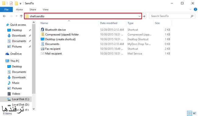 ۲- در مرحله ی دوم File Explorer ویندوز را باز نموده و دستور shell:sendto را در نوار آدرس وارد کرده و Enter بزنید.
